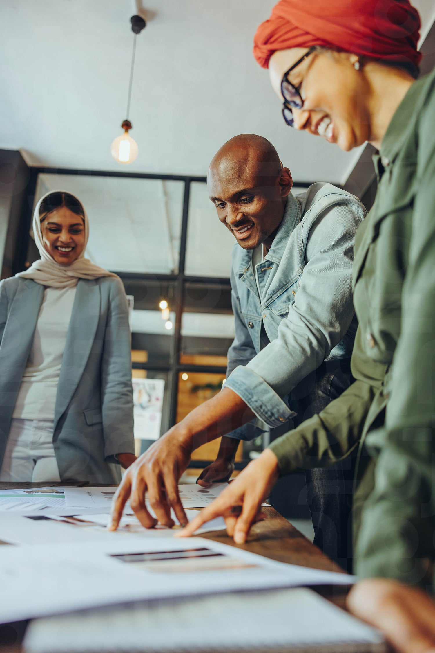 Happy interior designers working with colour palettes in a modern office. Group of multicultural businesspeople sharing innovative ideas in a creative workplace.