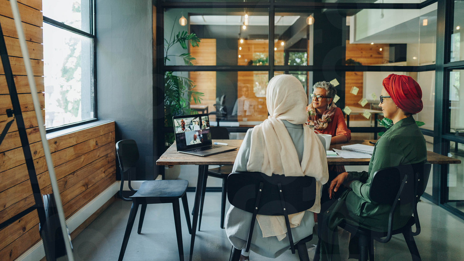 Team of diverse businesswomen attending an online meeting in a modern office. Multicultural businesswomen having a a video conference with their business partners in a creative workplace.