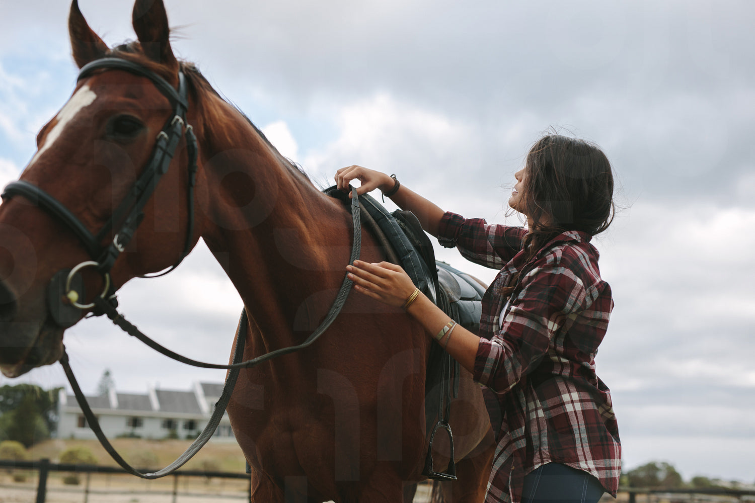Equestrian woman preparing horse for ride. Young female horse ride with her horse in putting saddle on back in stable.