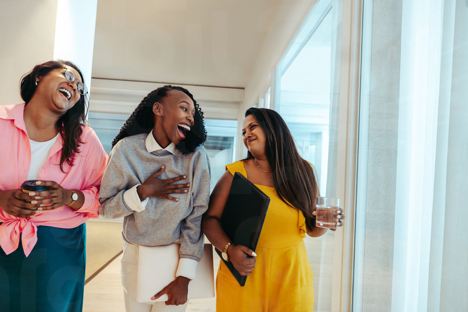 Three colleagues sharing a laugh on a relaxed Friday afternoon while walking through the office corridor