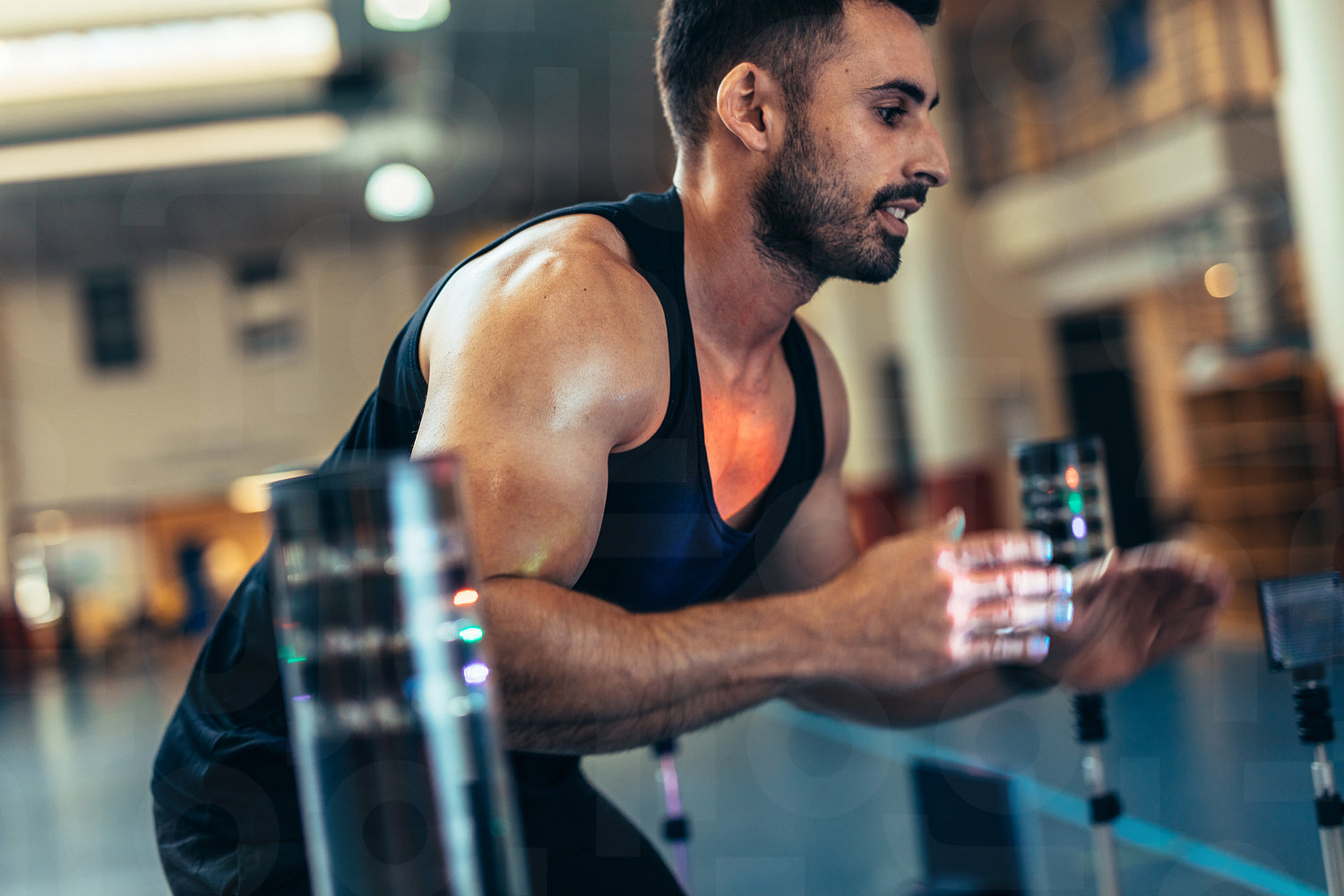 Sportsman using a visual stimulus system for improving reaction time. Hand-eye coordination training session at sports science lab.
