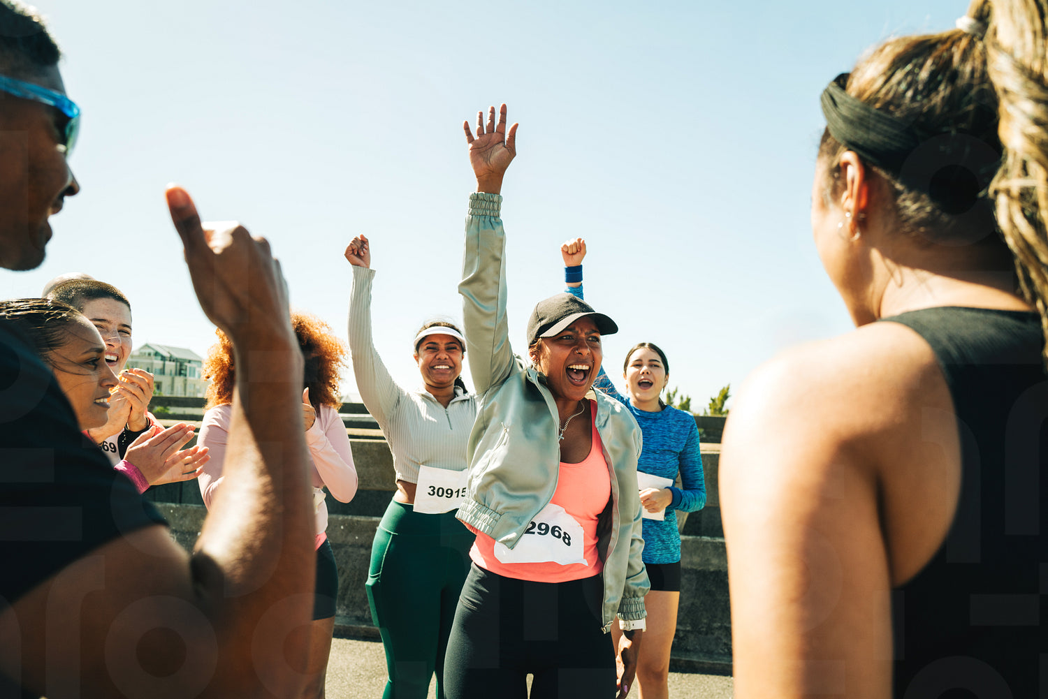 A group of friends rejoices and celebrates after completing a marathon together. They are all cheering energetically, capturing the essence of teamwork, joy, and achievement.