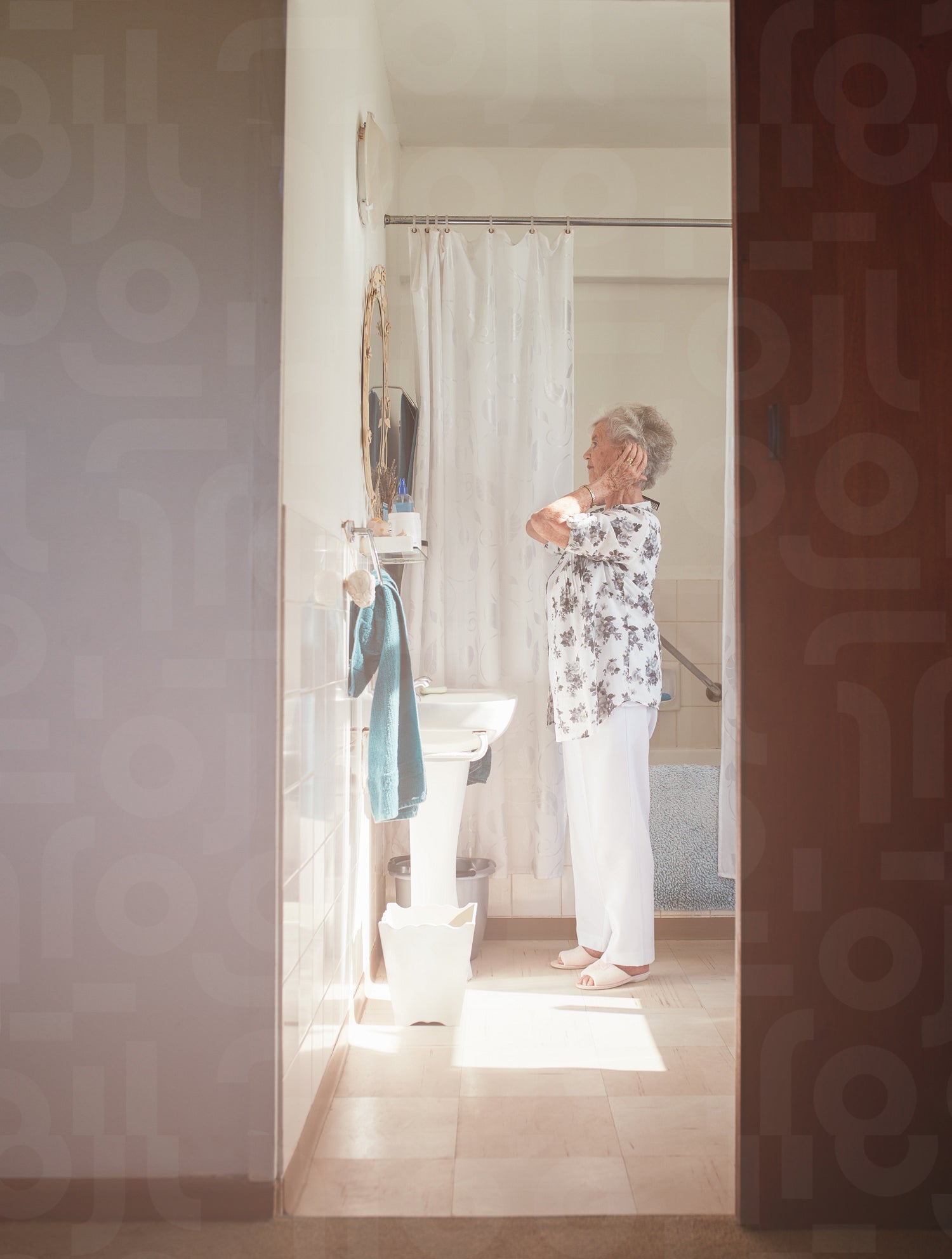 Full length indoor shot of elderly woman getting ready at dresser. Senior female getting ready in bathroom.