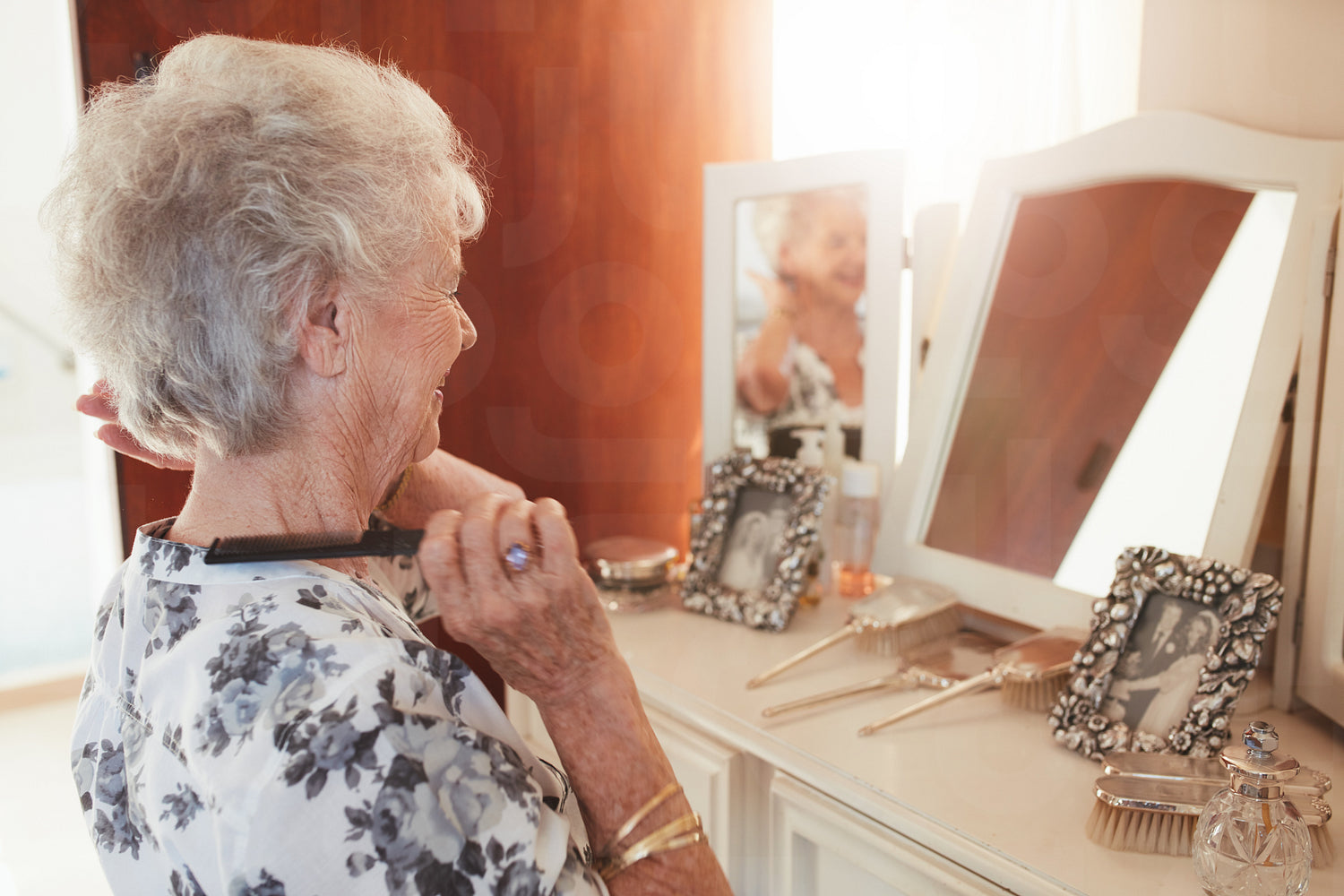 Happy senior woman combing her hair at dresser in house. Elderly female getting ready in front of a mirror at home.