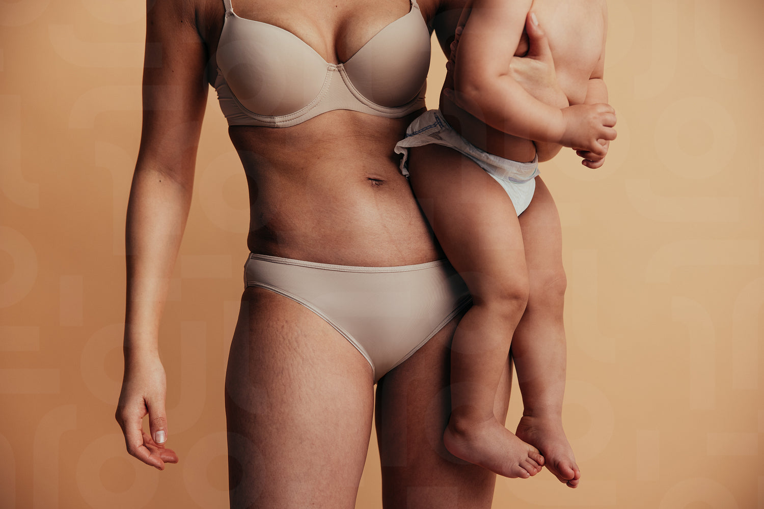 Cropped shot of mother carrying her baby. Female holding her baby in her arm against brown background.