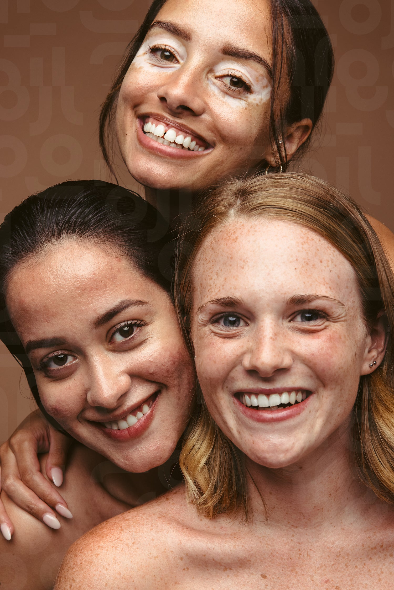 Close up portrait of three smiling young women together. Portrait of woman with skin problems in cheerful mood representing self acceptance and body positivity.