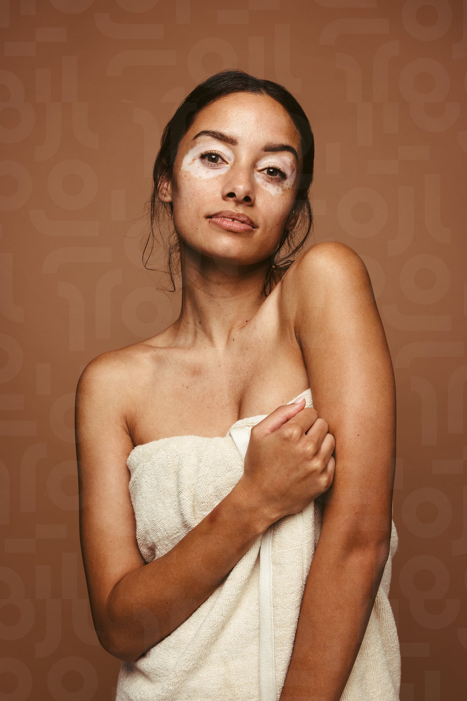Young woman with vitiligo problem accepting her skin the way it is. Portrait of confident young woman in bath towel against brown background.