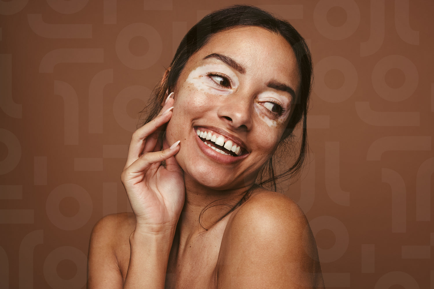 Portrait of smiling woman having vitiligo on face. Close up of happy woman with skin problem on brown background.