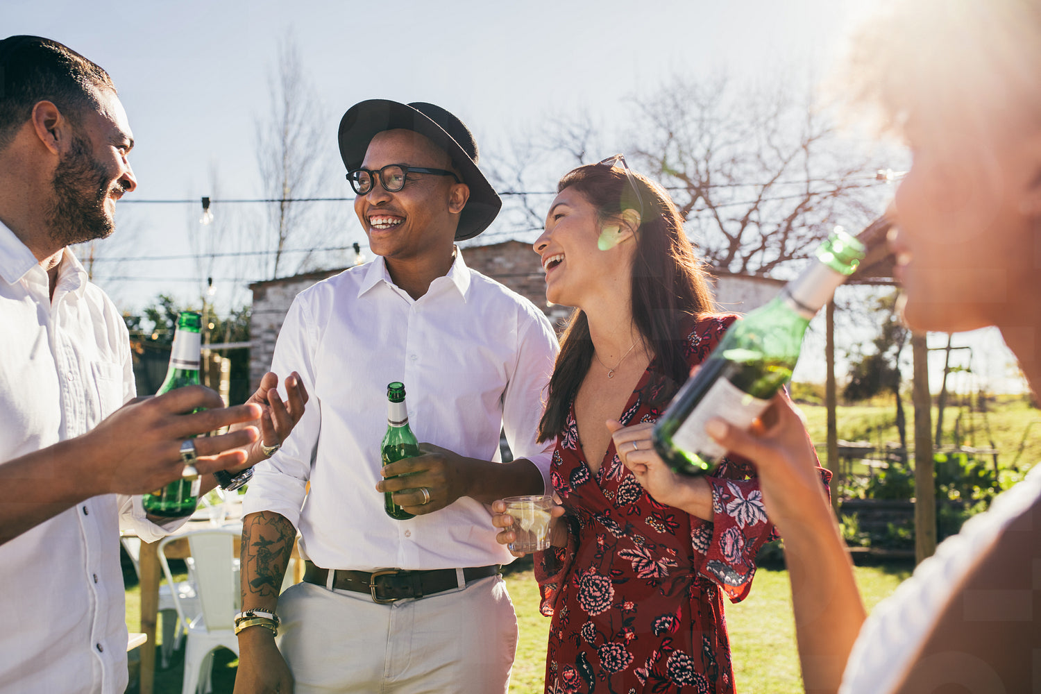 Happy young people having fun at the party and drinking beer. Group of friends hanging out together at a restaurant.