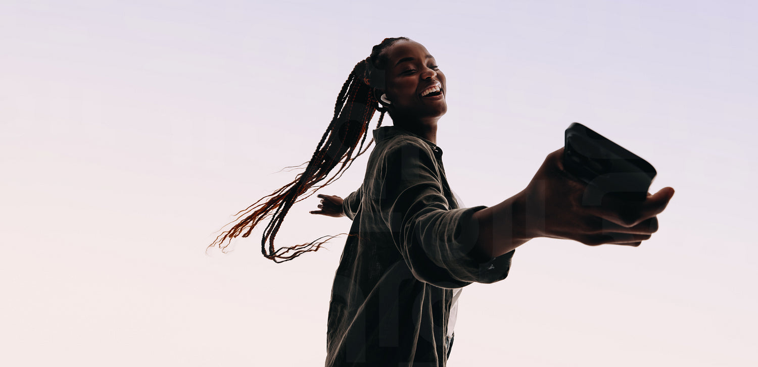 Woman dancing while holding a smartphone. She listens to music with earbuds, her braids adding to her style. With energetic moves, she celebrates life, embodying self-confidence and happiness.