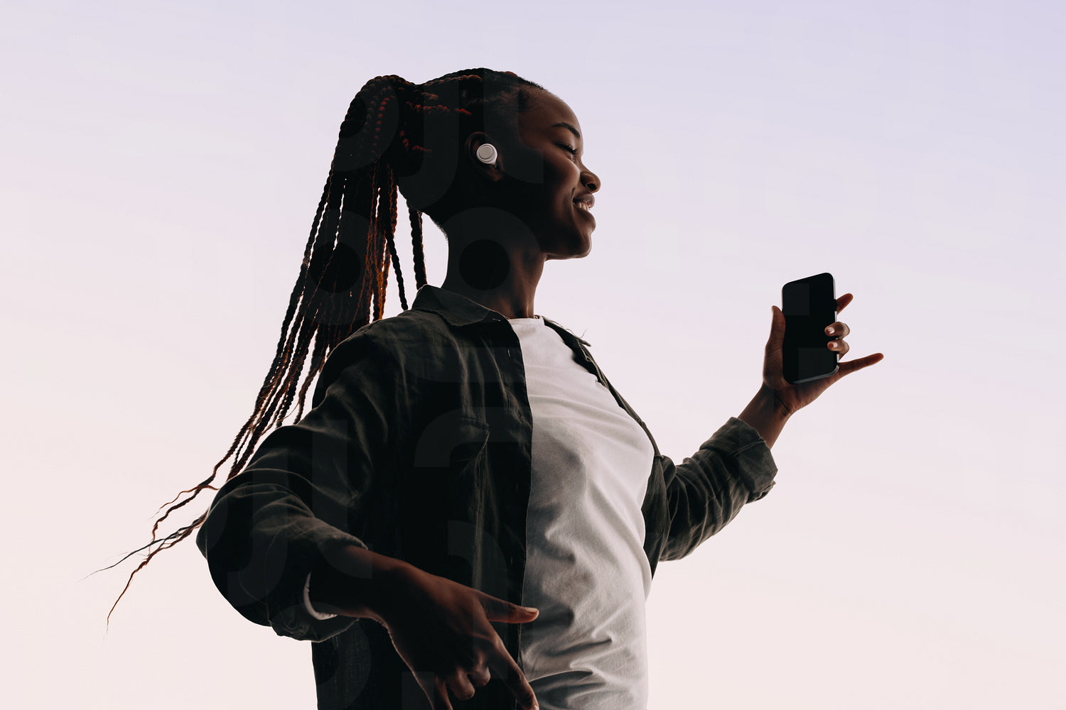 Young woman with braids dances confidently in a studio with earbuds in and smartphone in hand. She celebrates Gen Z's love for music and technology, smiling happily as she moves to the rhythm.