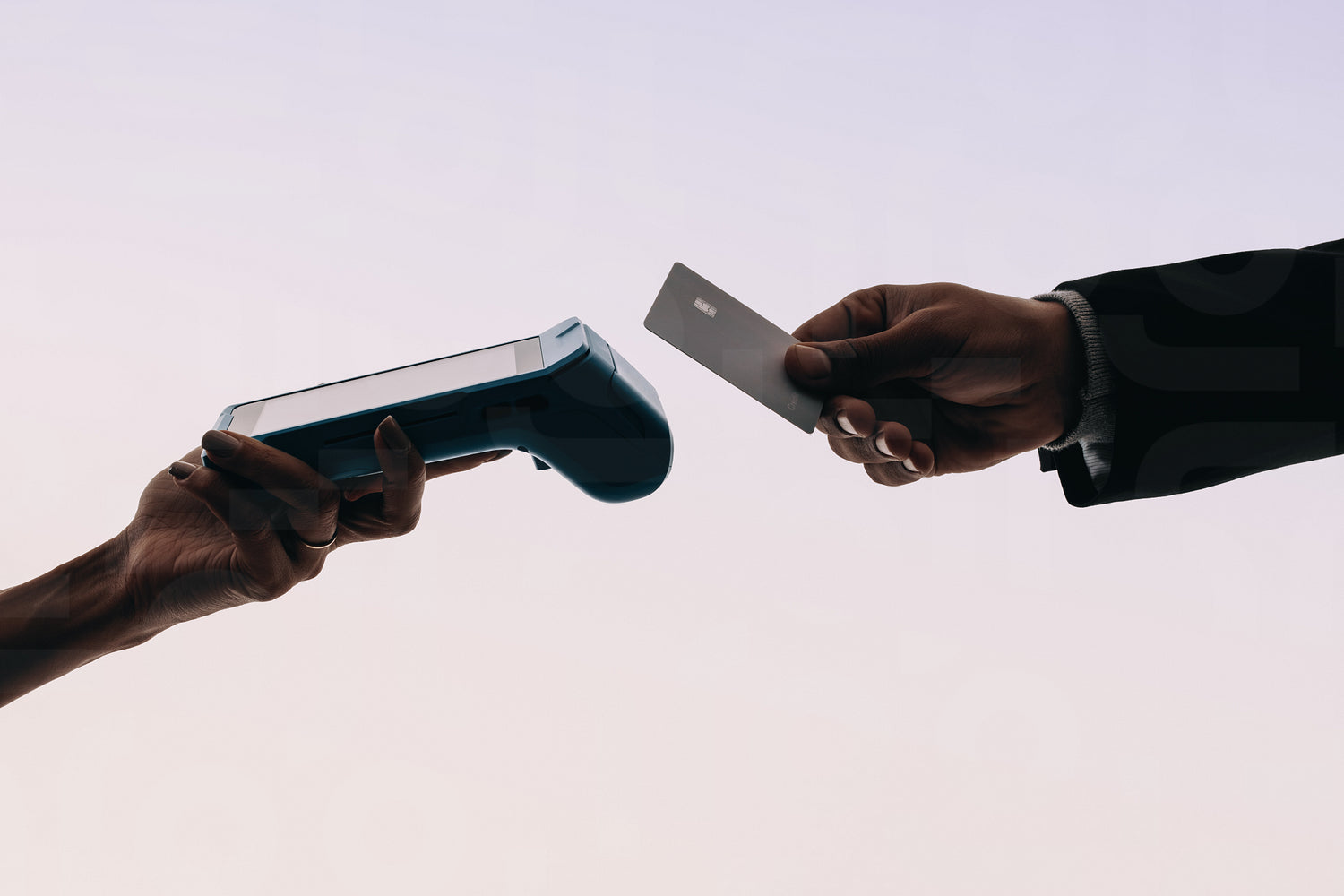 Customer holding their credit card near the POS machine, ready to pay. Contactless technology makes transactions quick and convenient. Two hands engaged in a seamless electronic payment, showcasing a cashless future.