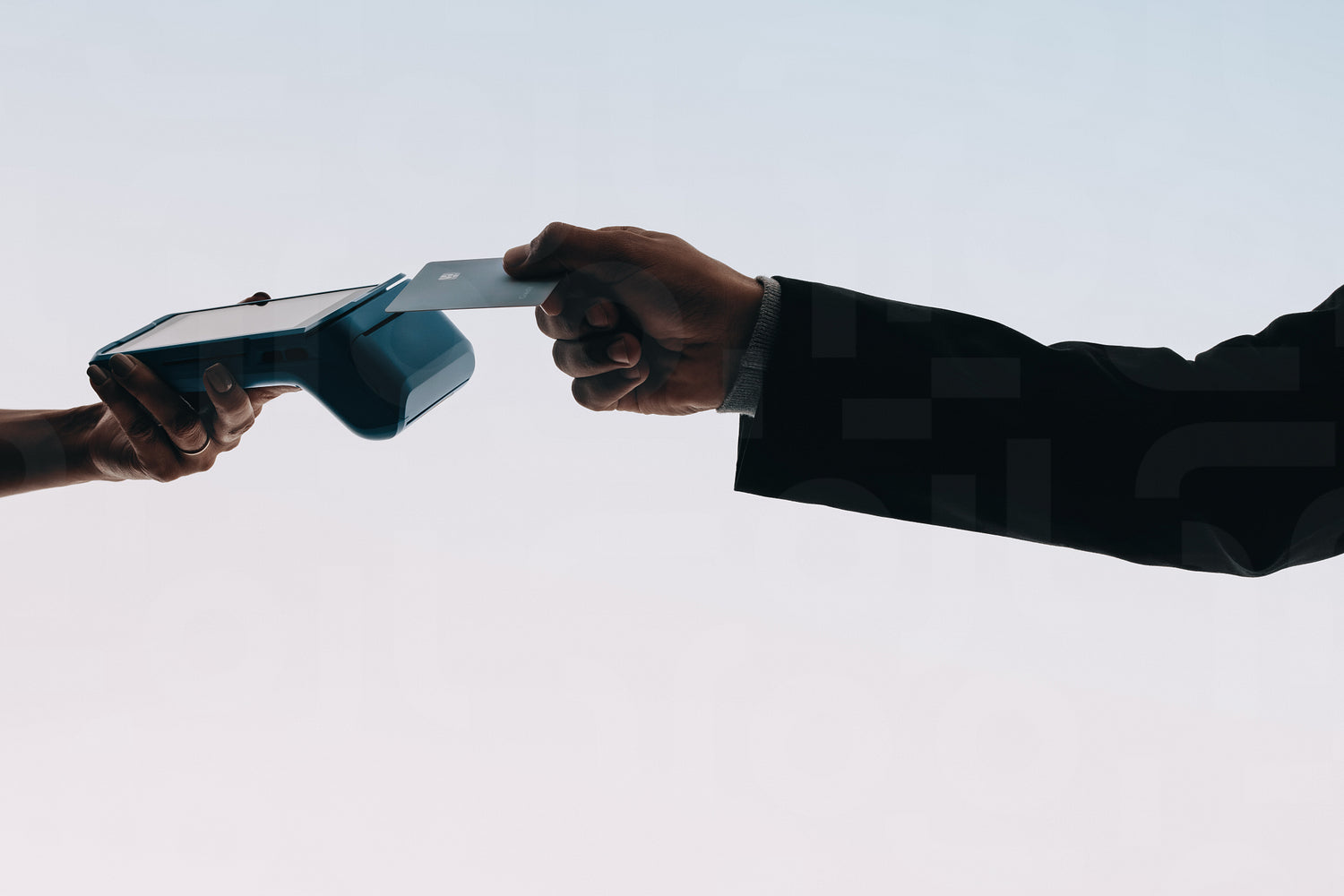 Man tapping his credit card on a reader for a contactless payment in a studio. This modern technology offers convenience, allowing customers to pay using credit or debit cards.