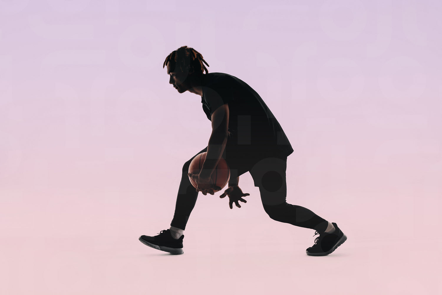 Silhouette of a young basketball player dribbling ball in studio with pink background