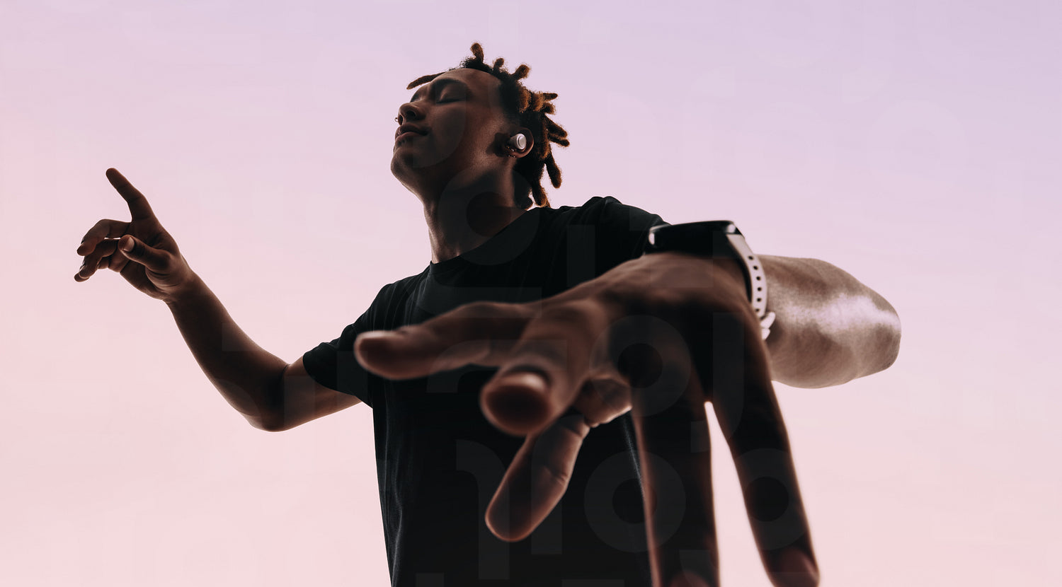 Gen Z man with dreadlocks energetically dances in a studio. Eyes closed, he moves to the rhythm of the music, hands flowing. Wearing a pink shirt, he listens on wireless earbuds while a smartwatch keeps time.