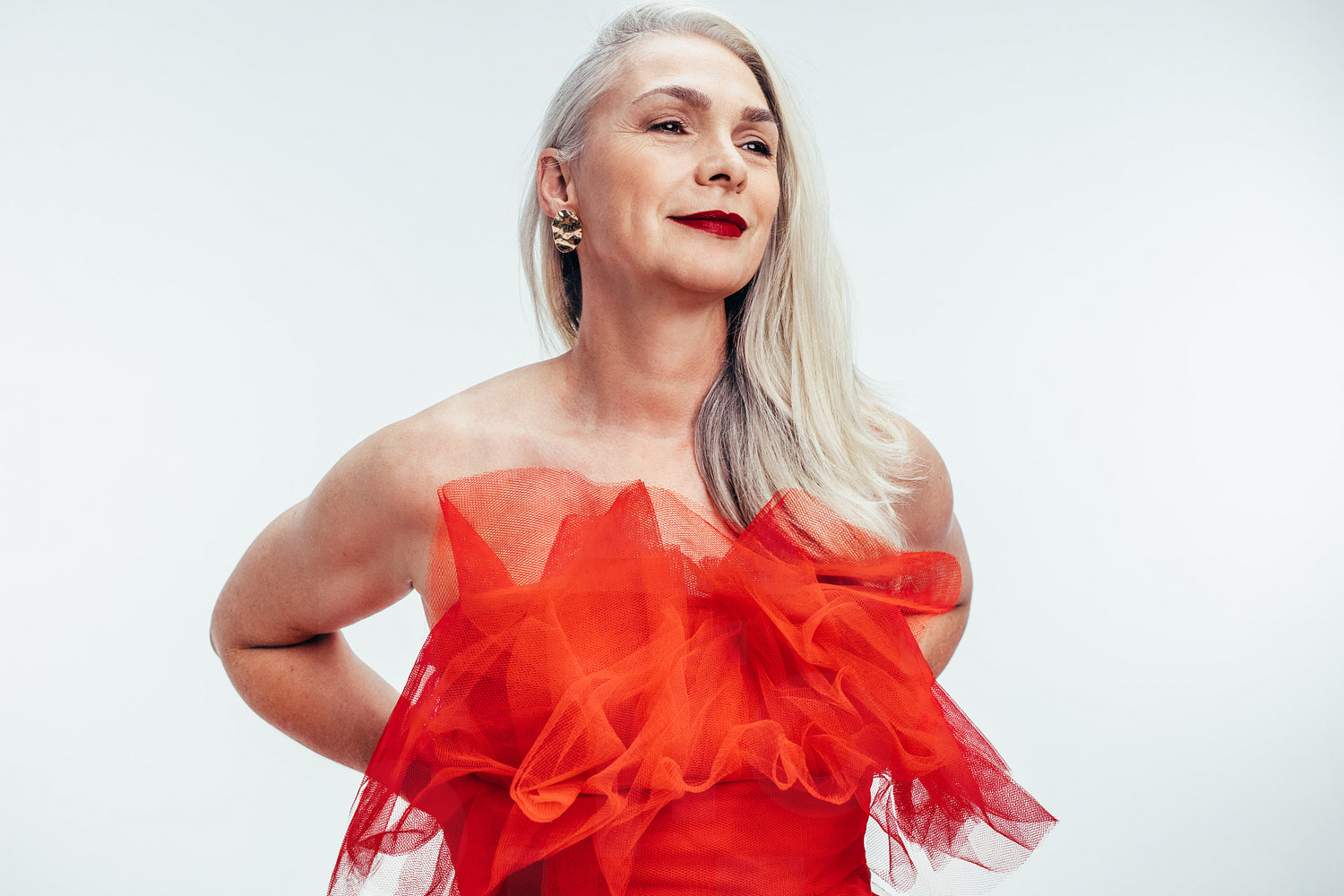Attractive mature woman in beautiful evening gown over white background. Beautiful senior woman posing in stylish outfit.