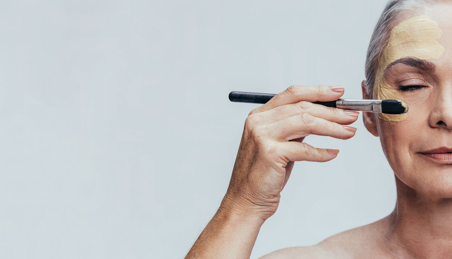 Half face of senior woman applying beauty cosmetics on her face with a makeup brush. Elder woman applying liquid foundation on her face with a brush.