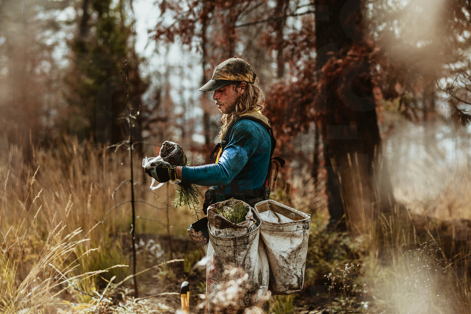 Man working in forest planting new pine seedlings. Tree planter for forest conservation.