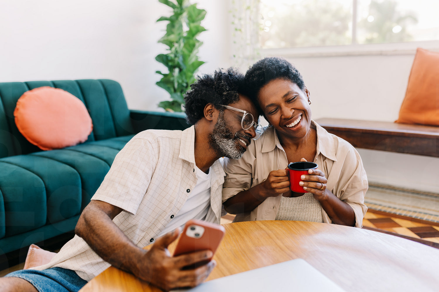 Affectionate black couple sitting in their living room at home, bonding and relaxing. The husband holds a phone while the wife enjoys a cup of coffee, cherishing quality time together.