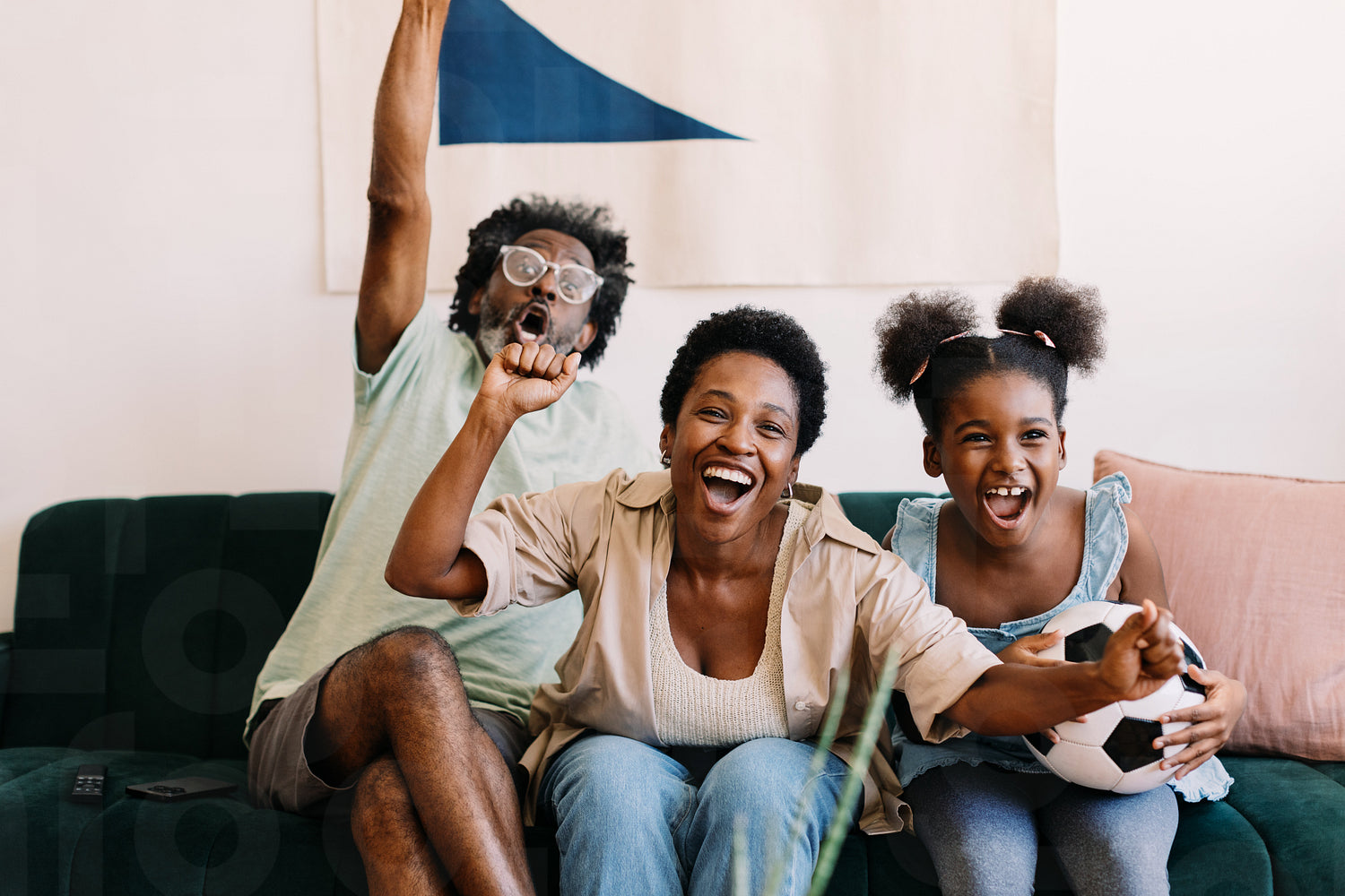Excited black family at home, celebrating and enjoying a football match together on the couch. The parents and daughter are happy, smiling, and cheering for their team. The young girl holds a soccer ball, displaying her love for the sport.