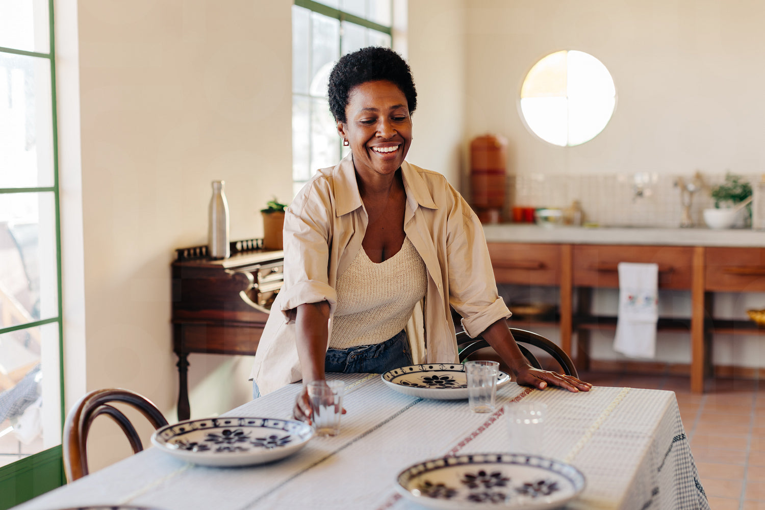 Happy, mature black woman with afro hair prepares to serve a family breakfast in a Brazilian kitchen. Woman smiling while setting the dining table with plates in her home.