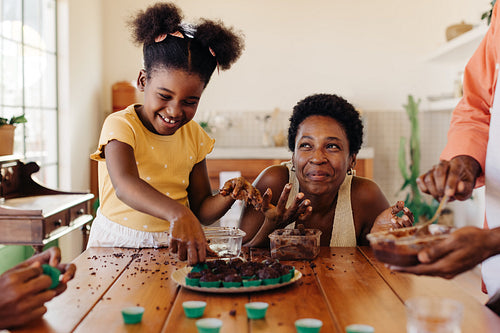 Happy Brazilian family making traditional brigadeiro dessert together