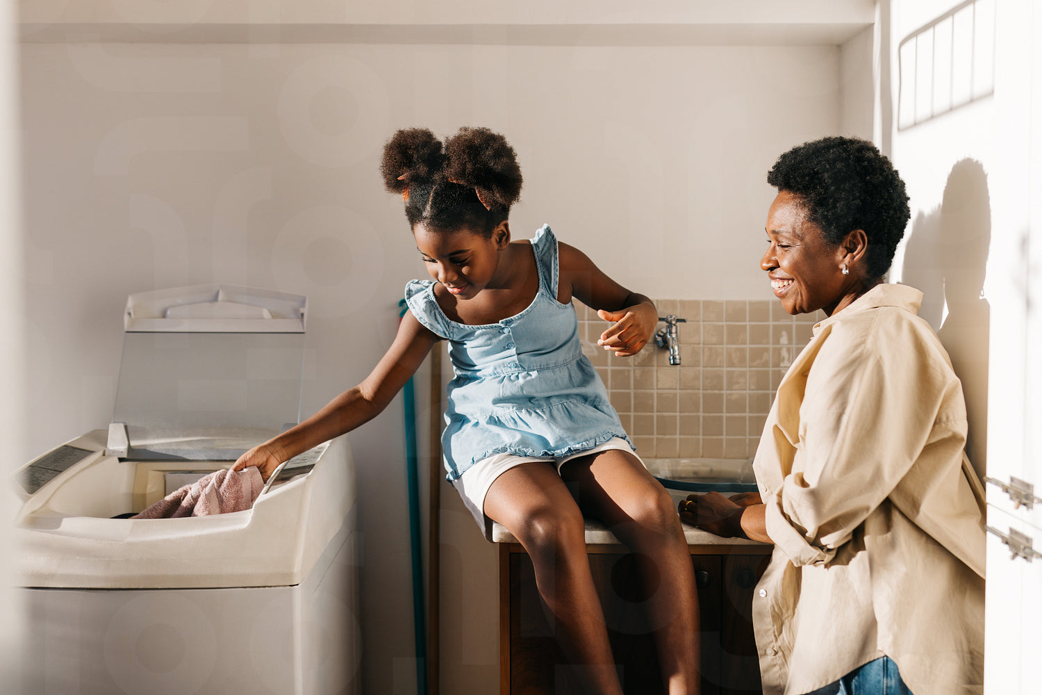 Happy black mother and her young daughter bond while washing clothes in a tidy laundry room. Mature stay at home mom enjoying the role of homemaking and teaching cleanliness skills to her child.