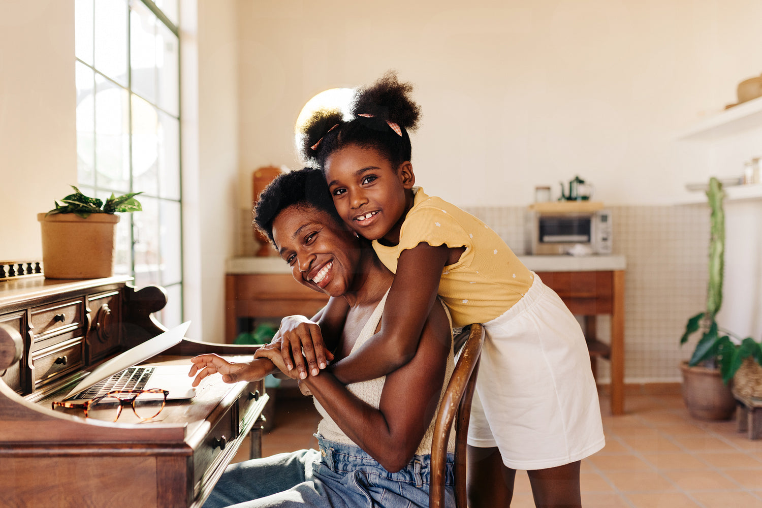 Mom embraces her daughter, showing the love and bond in their authentic Brazilian family. Working from home, she balances work and motherhood, sharing quality time together. The smiling duo radiates happiness and contentment, creating a harmonious atmosphere.