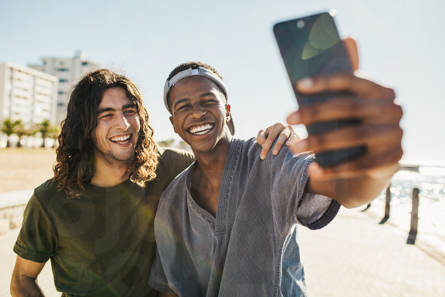 Two young men standing together outdoors taking a selfie and smiling. Best friends taking a selfie while standing on a seaside road on a summer day.