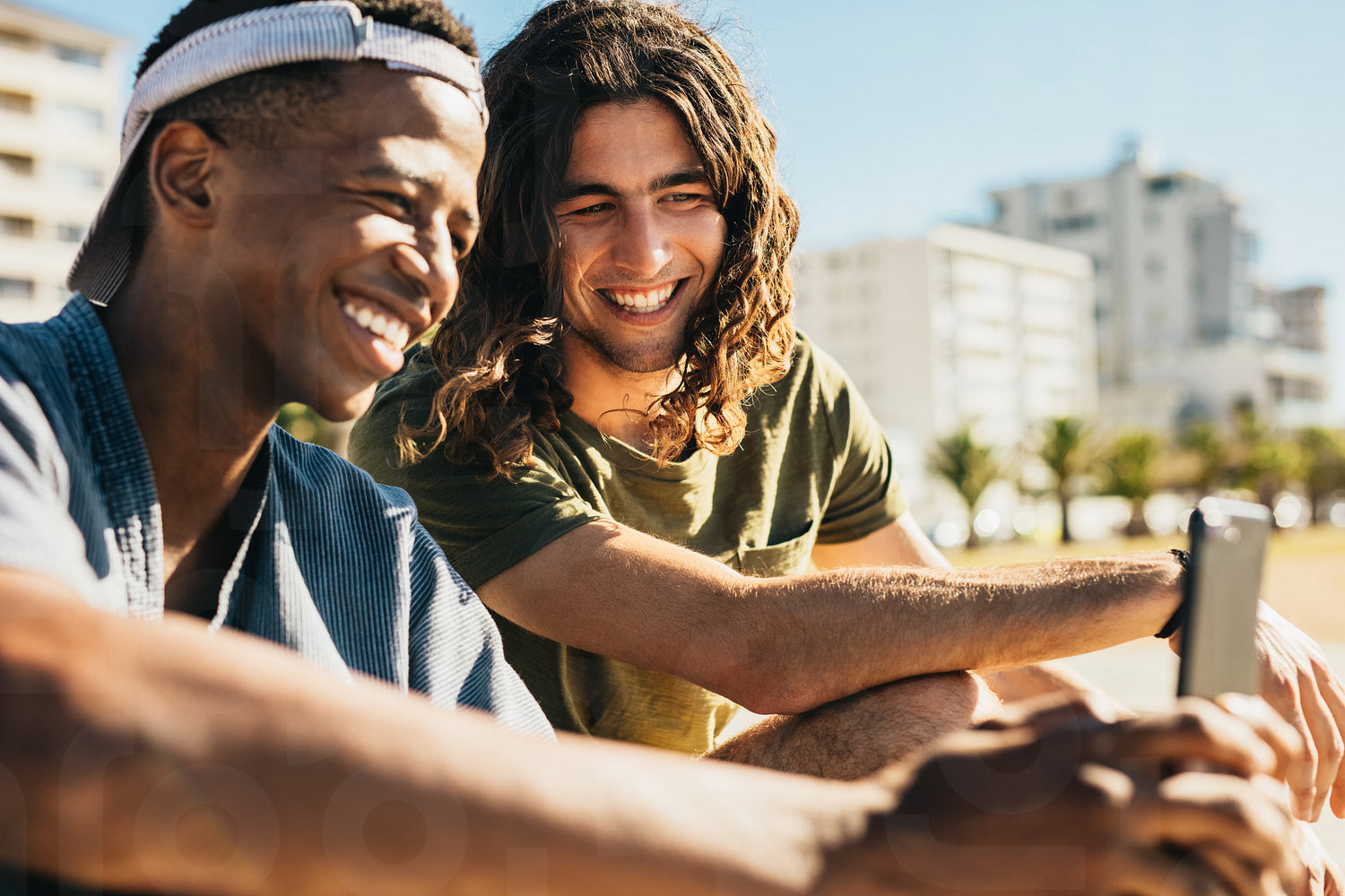 Young man with his friend looking at a mobile phone and smiling outdoors. Two young men sitting outdoors using a smart phone.