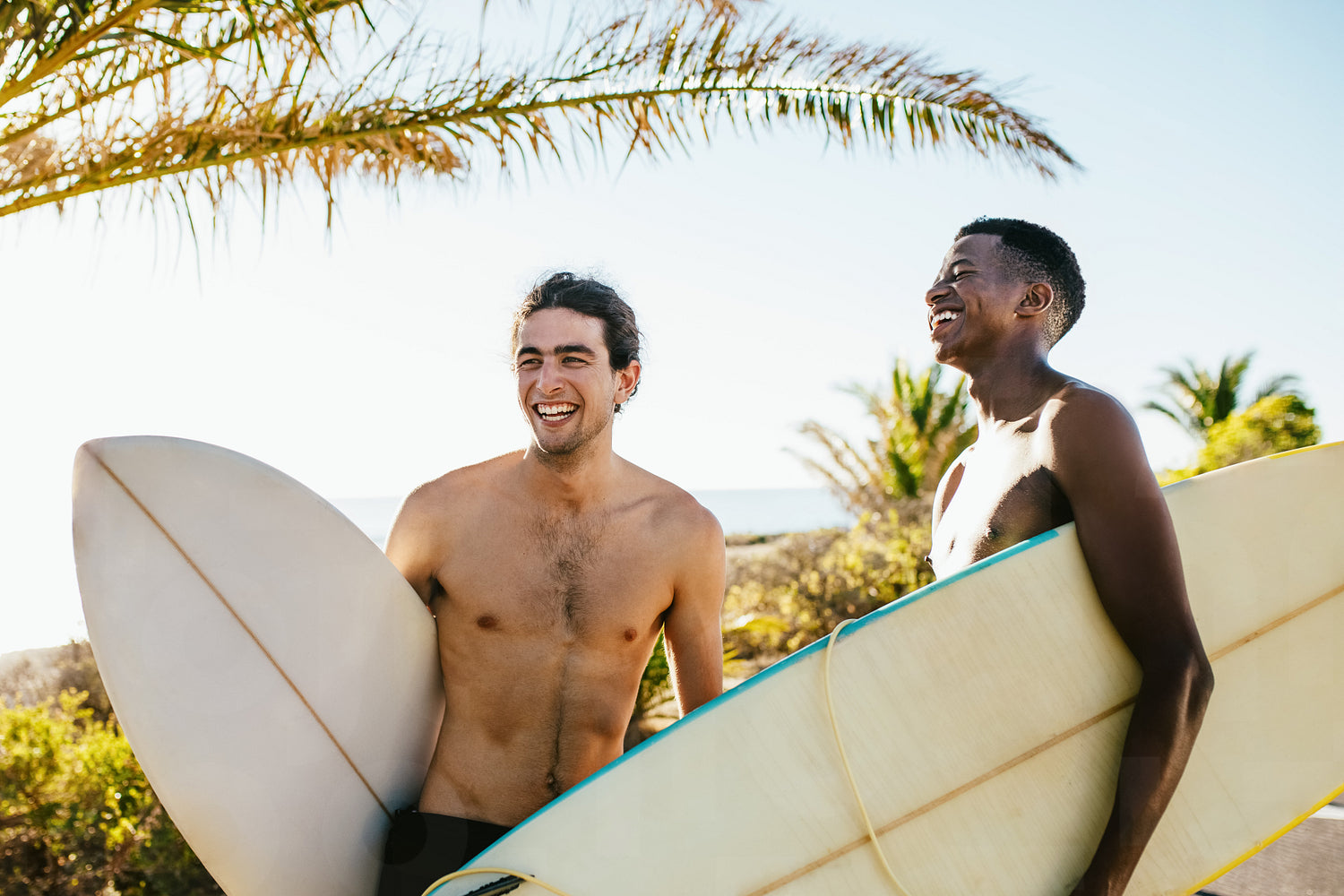 Male friends with surfboards walking and talking along the beach. Two men on a holiday going on water surfing.