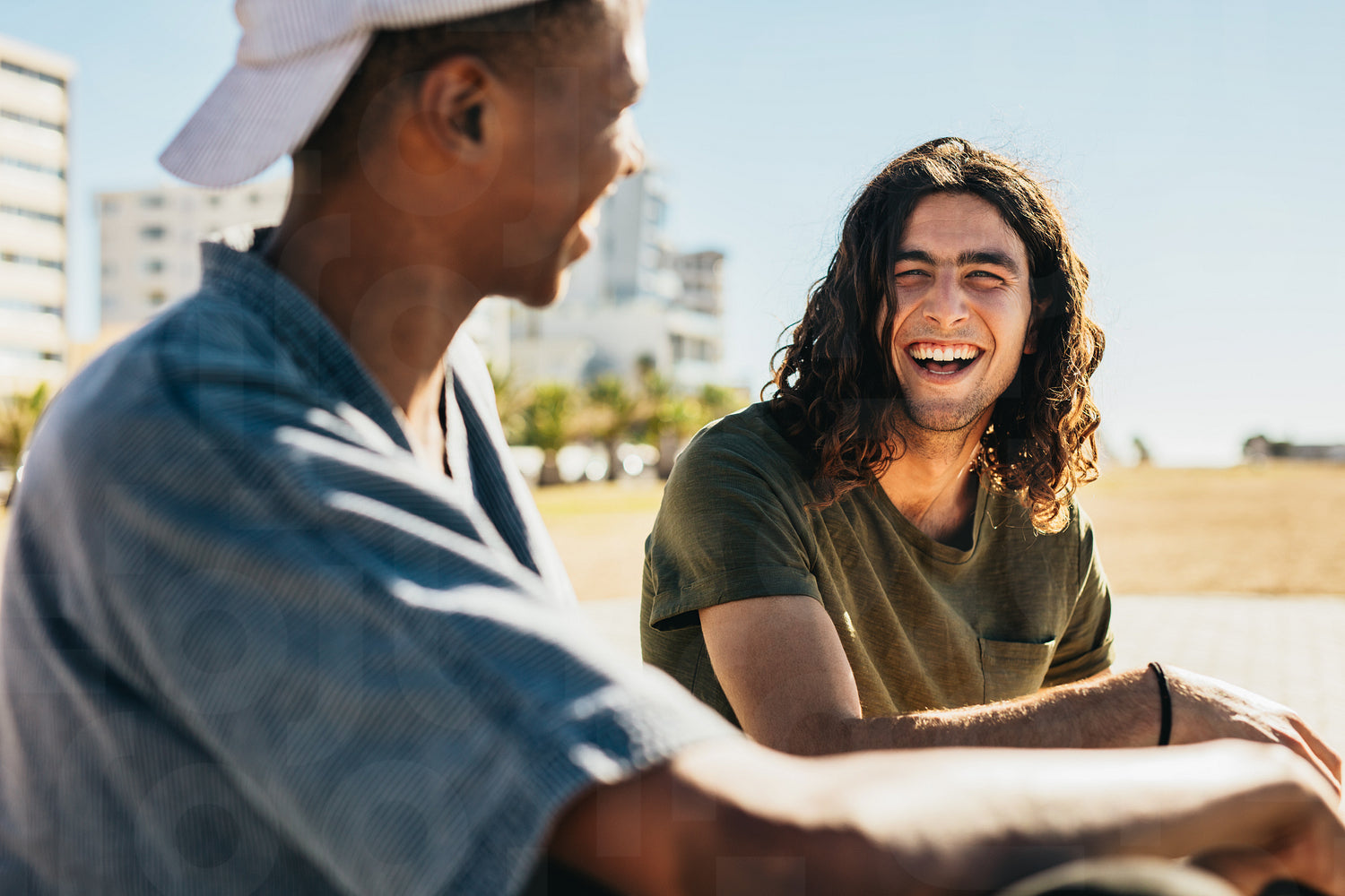 Young man smiling while talking with his friend outdoors. Two young men sitting outdoors and smiling at each other.