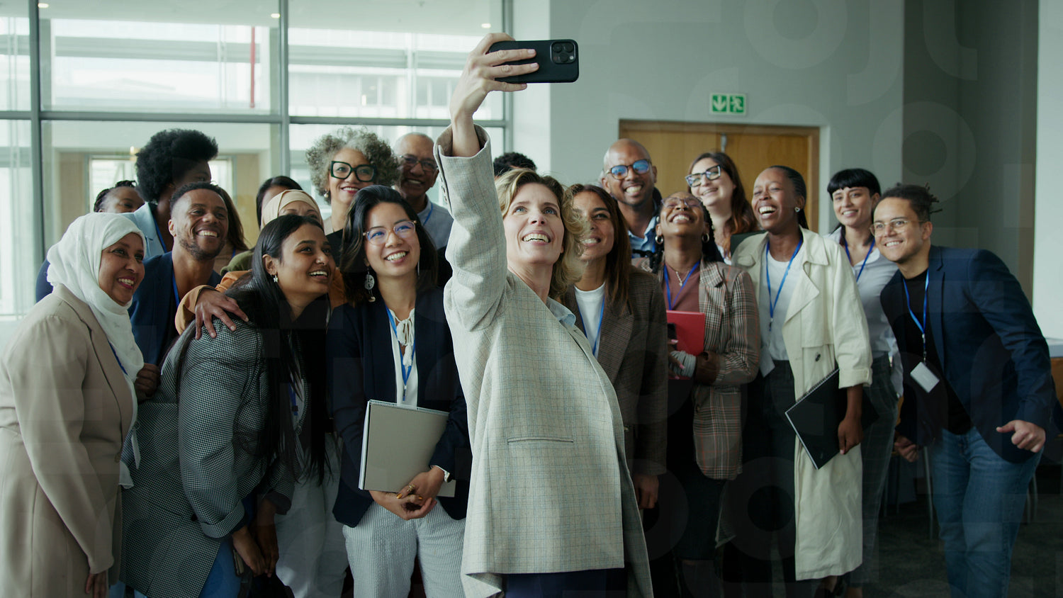 A cheerful group of colleagues and attendees happily pose for a group selfie at a conference or professional event. Their genuine smiles and laughter reflect a moment of positive connection.