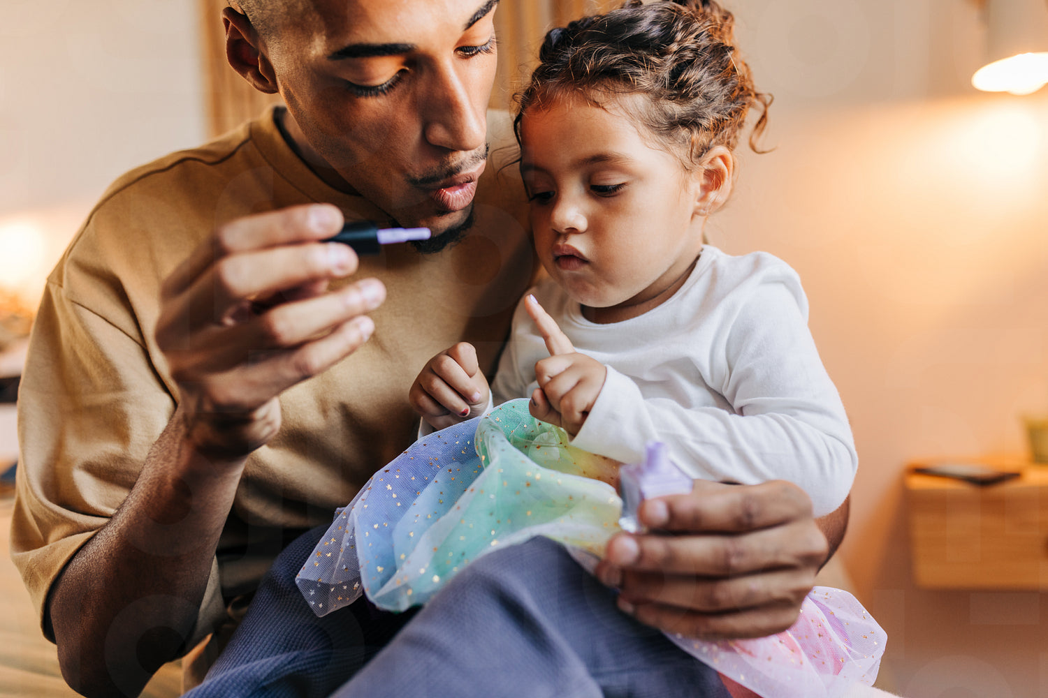 Modern dad applying nail polish on his daughter's nails while sitting on a bed. Loving single father spending some quality time with his adorable daughter at home.