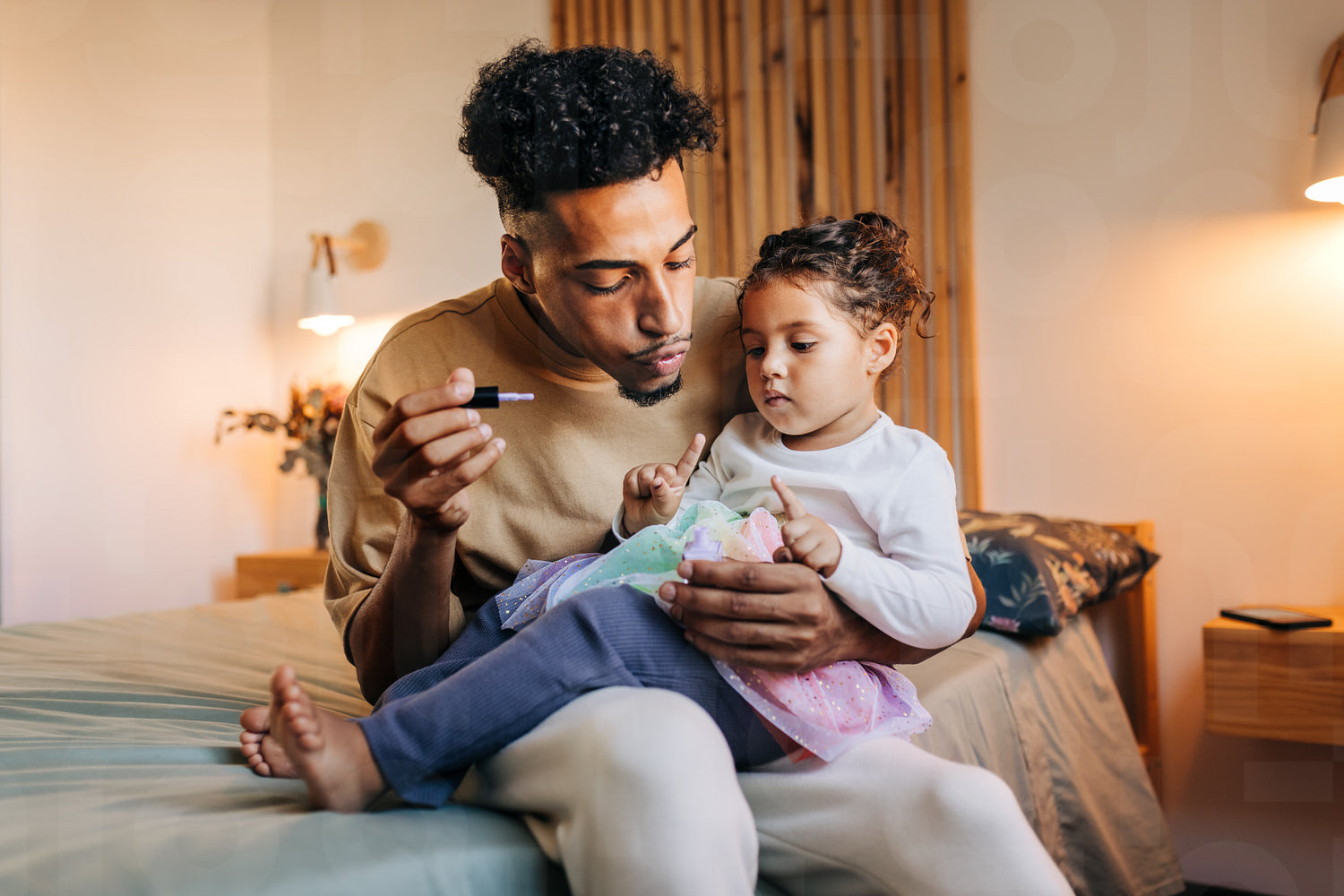 Single father blowing nail polish dry on his daughter's nails. Young dad painting his daughter's nails while sitting on a bed. Adorable father and daughter spending some quality time at home.