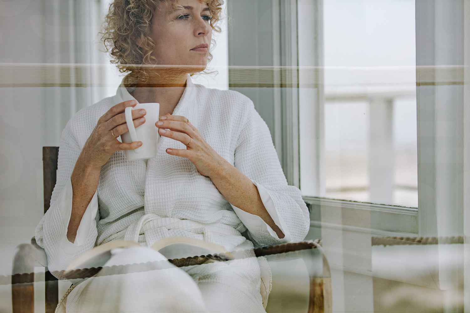 Woman in bathrobe reading a book enjoying coffee. Woman looking out of the window and thinking while reading a book.