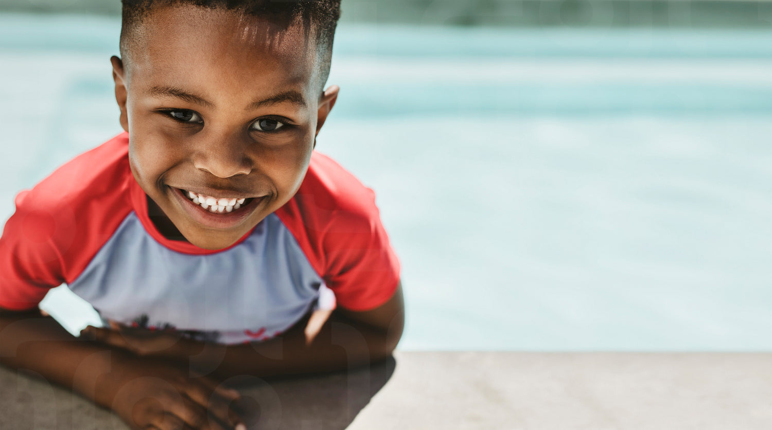 Closeup of cute boy on the edge of a swimming pool. Small boy in a pool looking at camera and smiling.