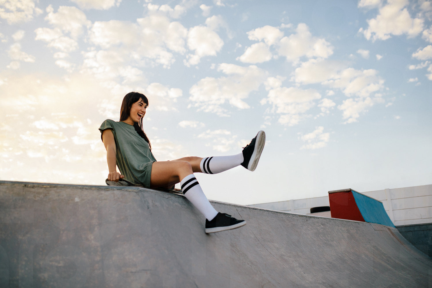 Smiling urban girl sitting on skateboard ramp in skate park. Woman skateboarder sitting on a ramp in a skate park having fun.