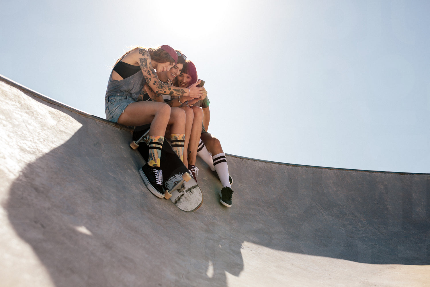 Group of women using mobile phone at skate park. Female skaters sitting on ramp and looking at smartphone.