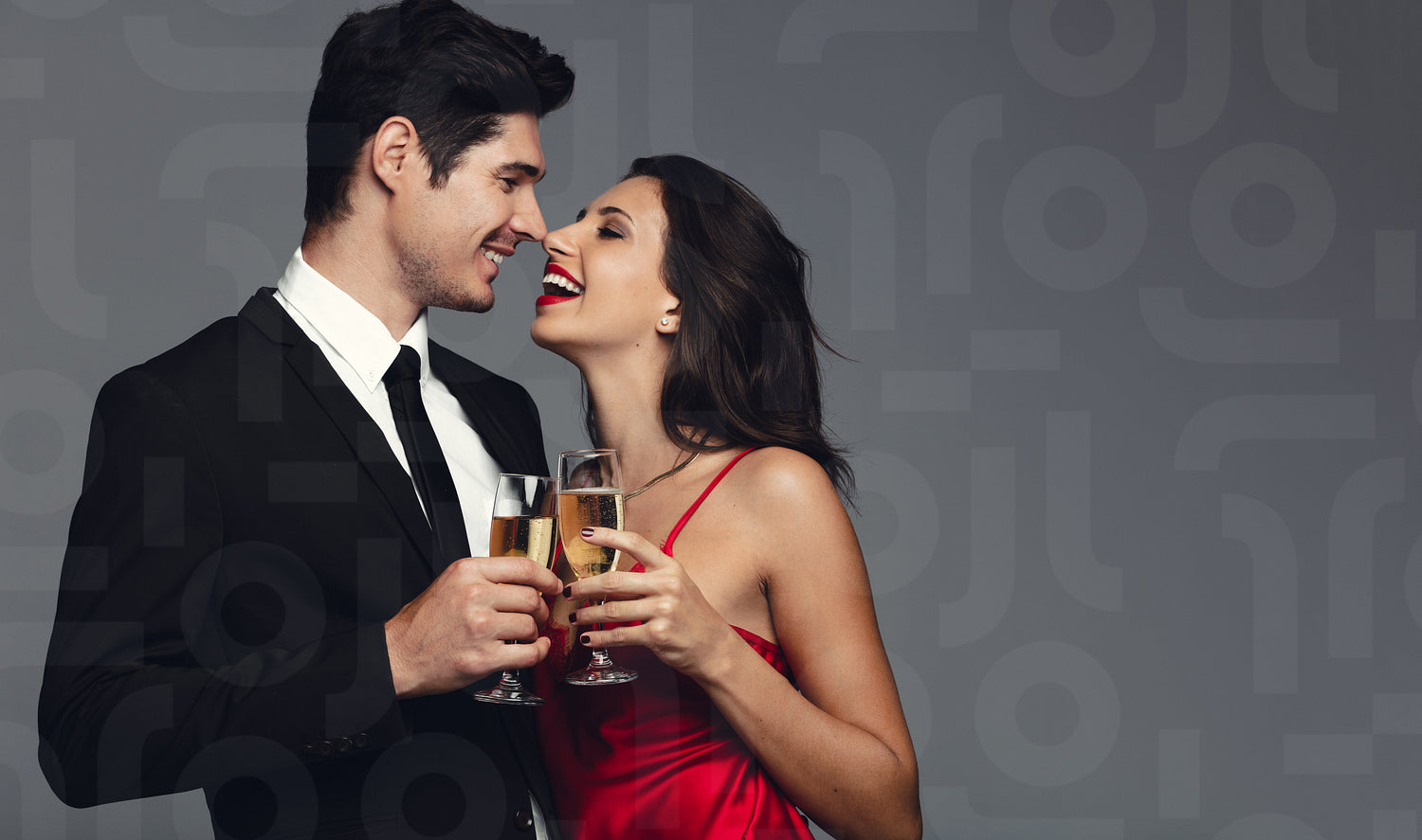 Happy young couple having champagne against grey background. Handsome young man and beautiful woman in stylish outfit having champagne and smiling.