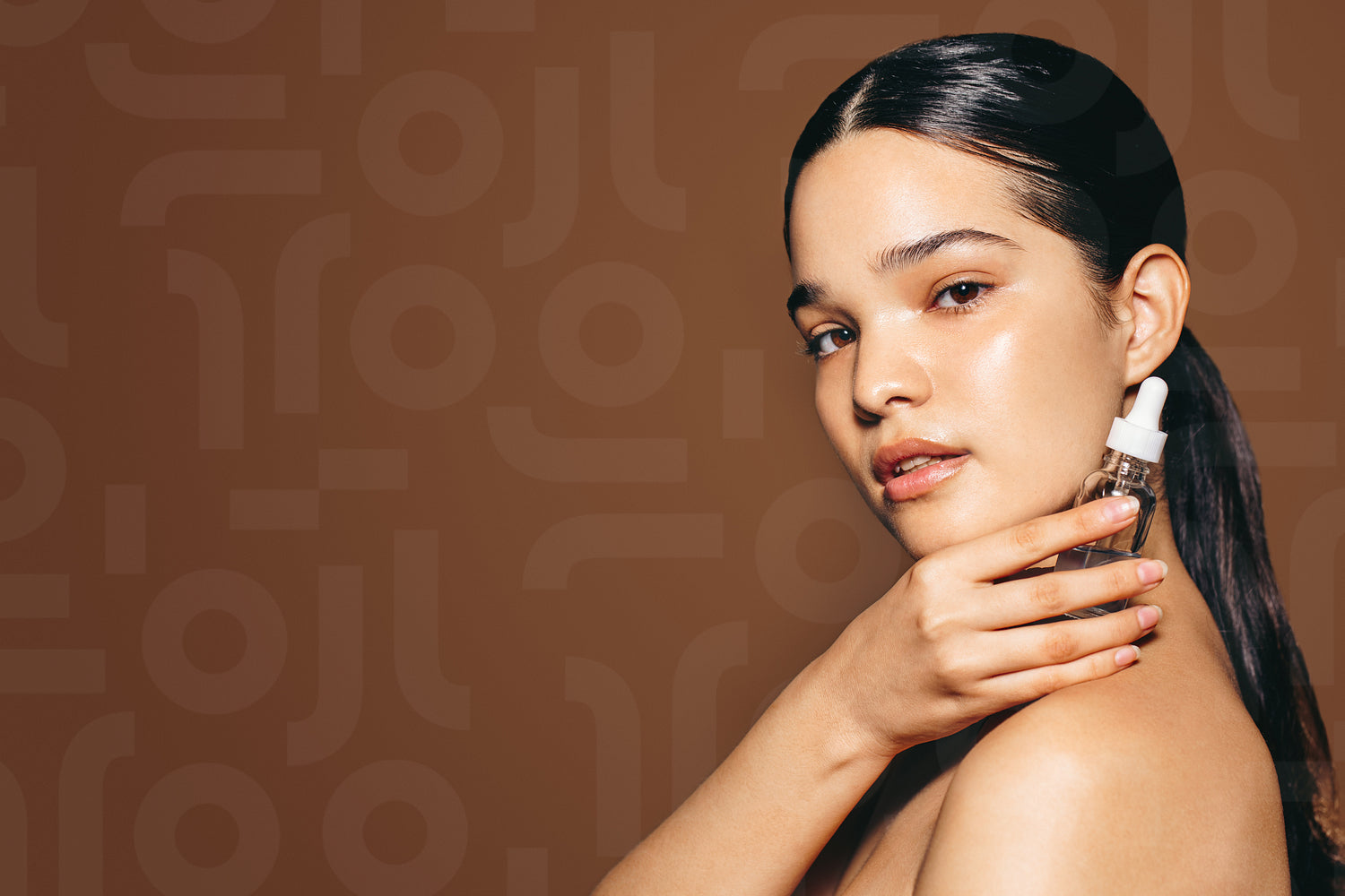 Using female cosmetic products for healthy skin: Portrait of a confident young woman holding face serum in a studio. Hispanic woman with beautiful skin showcasing her healthy skincare routine.
