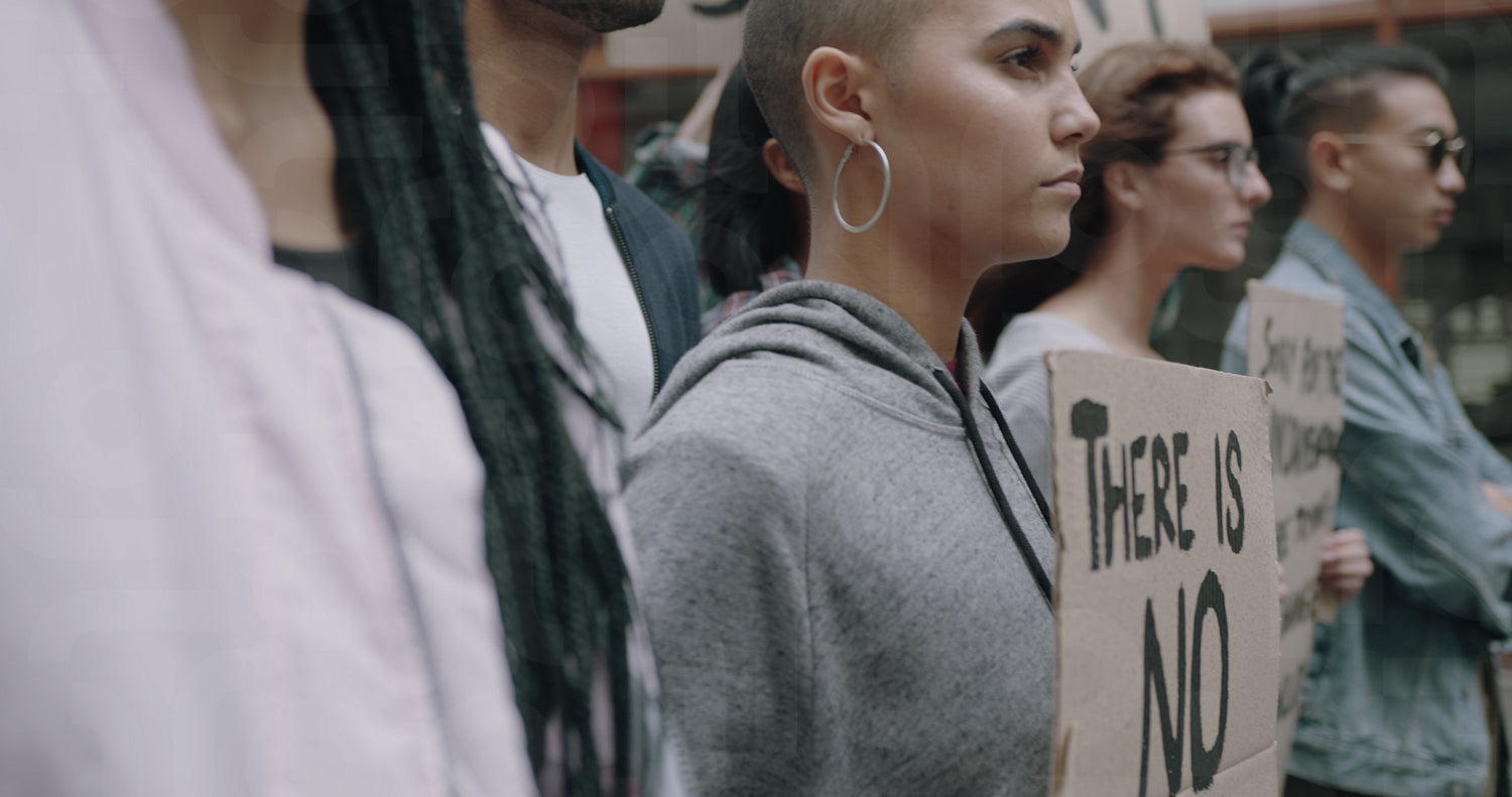Group of activists with banners protesting over pollution and global warming. Male and female rebellions doing a silent protest to save planet earth.