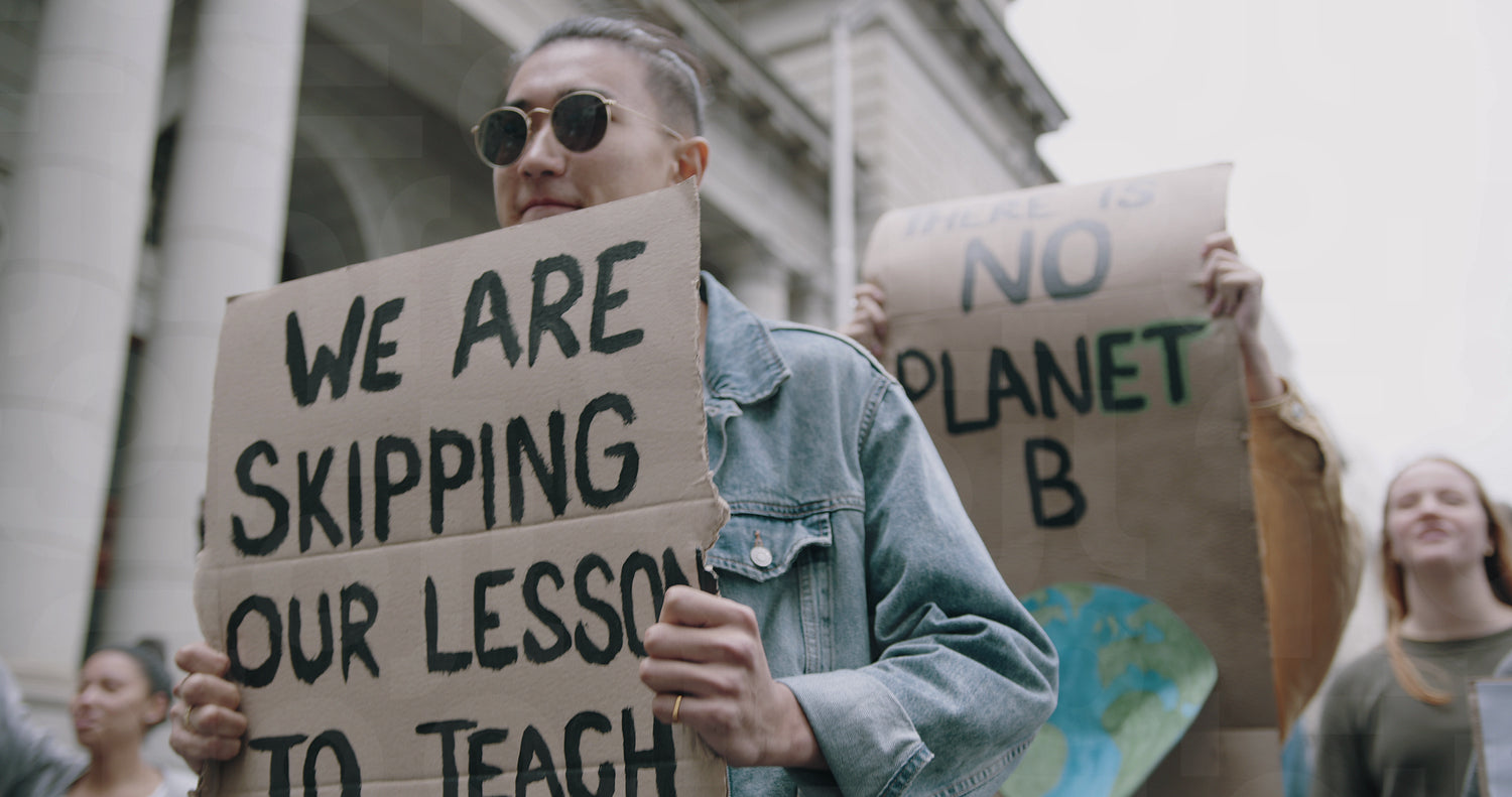 Group of students on the streets demonstrating against climate change. People protesting for problem in ecology, environment, global warming, industrial influence, climate emergency.