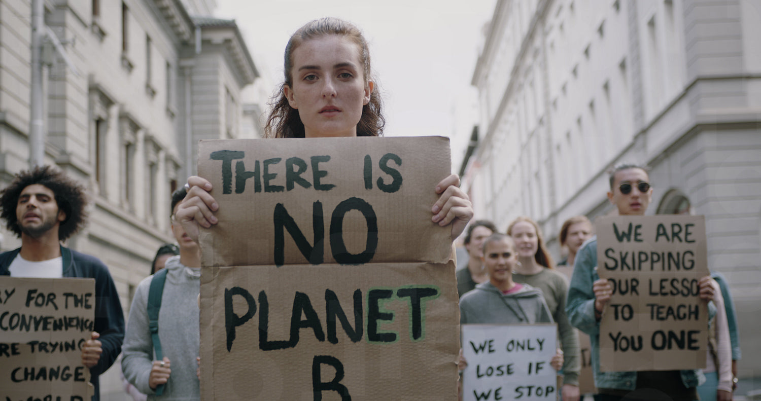 Woman holding a banner and protesting silently with group in background. Nonviolent demonstration over climate change in the city.