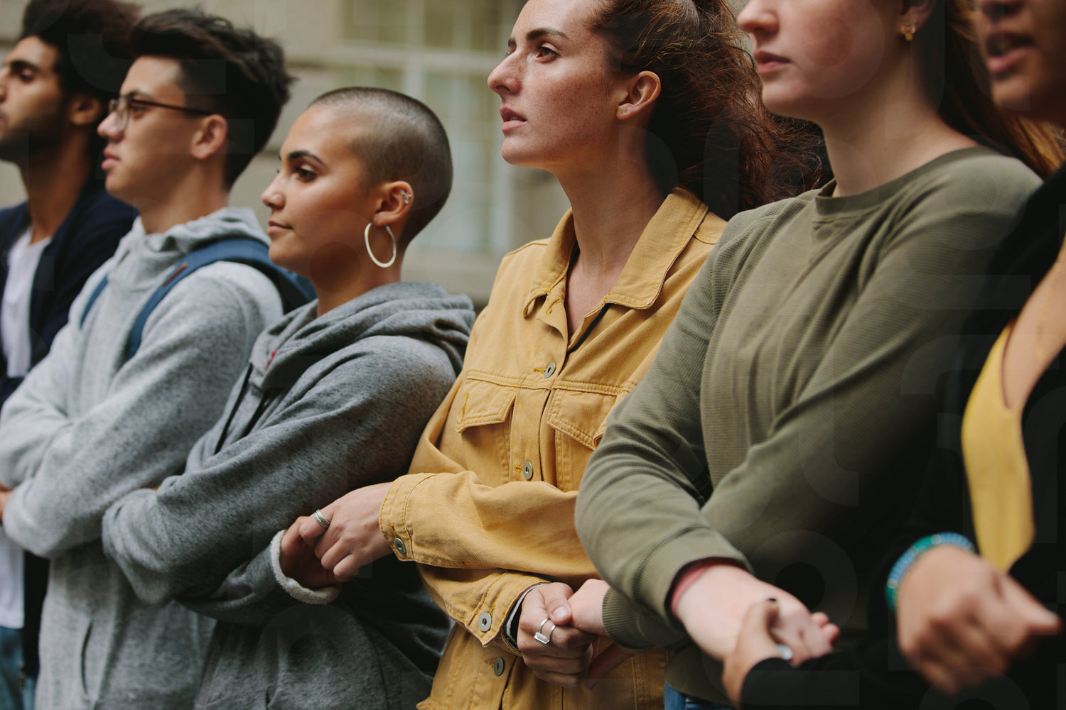 Group of protestors standing together holding hands in protest picket. Male and female activists protesting silently.