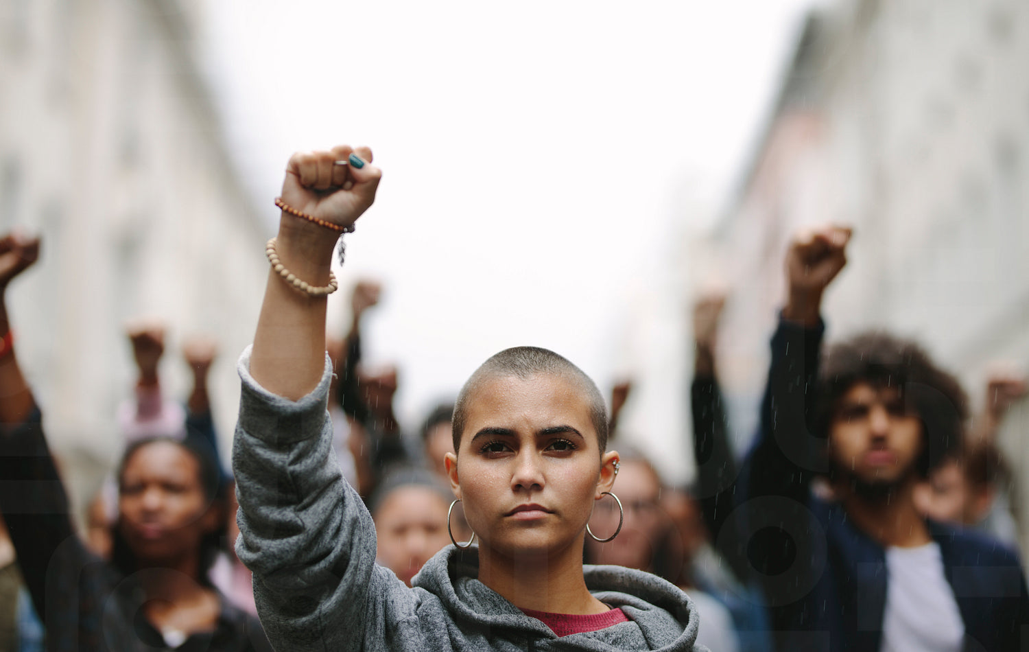 Young woman protesting on the street with her fist raised in air. Group of protesters on the road with their arms raised.