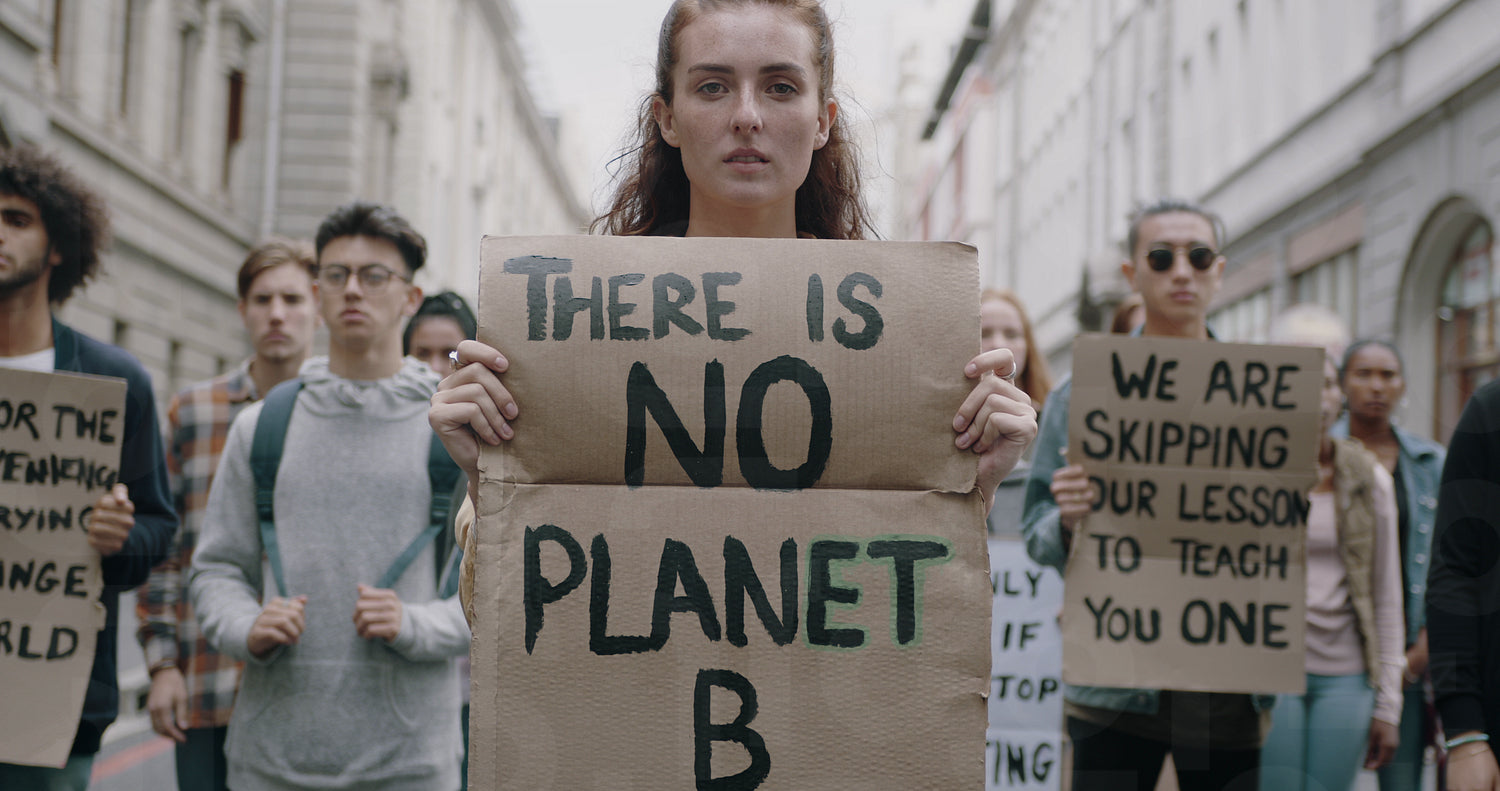 Activists silently protesting against global warming. Group of protestors standing on the street with posters. Nonviolent demonstration.