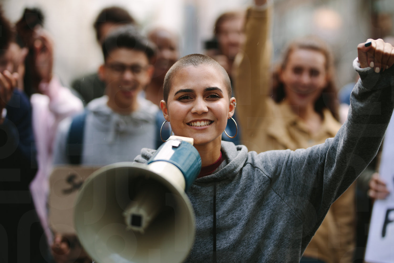 Young woman standing outdoors with group of demonstrator in background. Woman protesting with a megaphone outdoors on road.