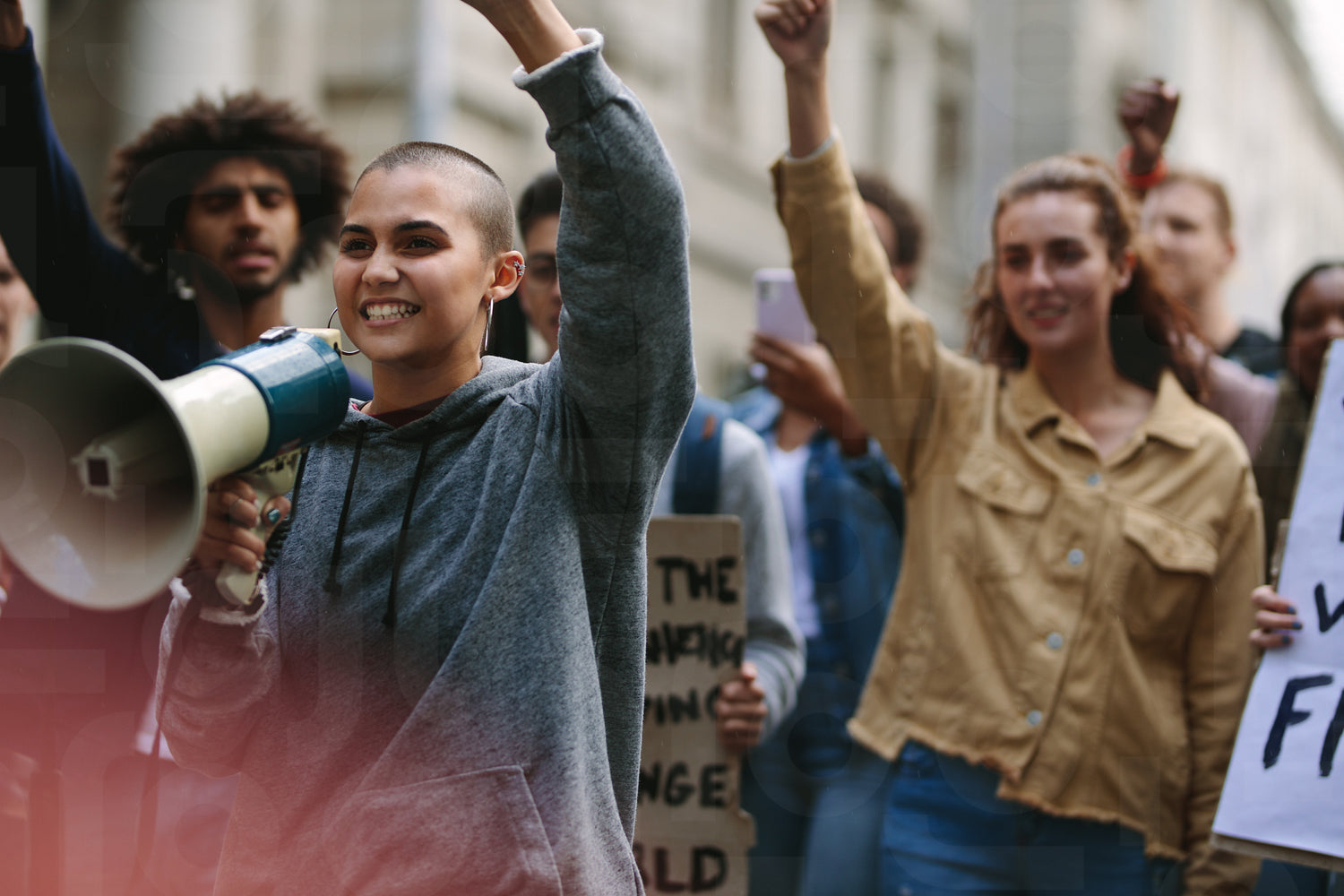 Young rebellious woman with megaphone during street protest. Female protestor yelling over a bullhorn as she participates in a street demonstration.