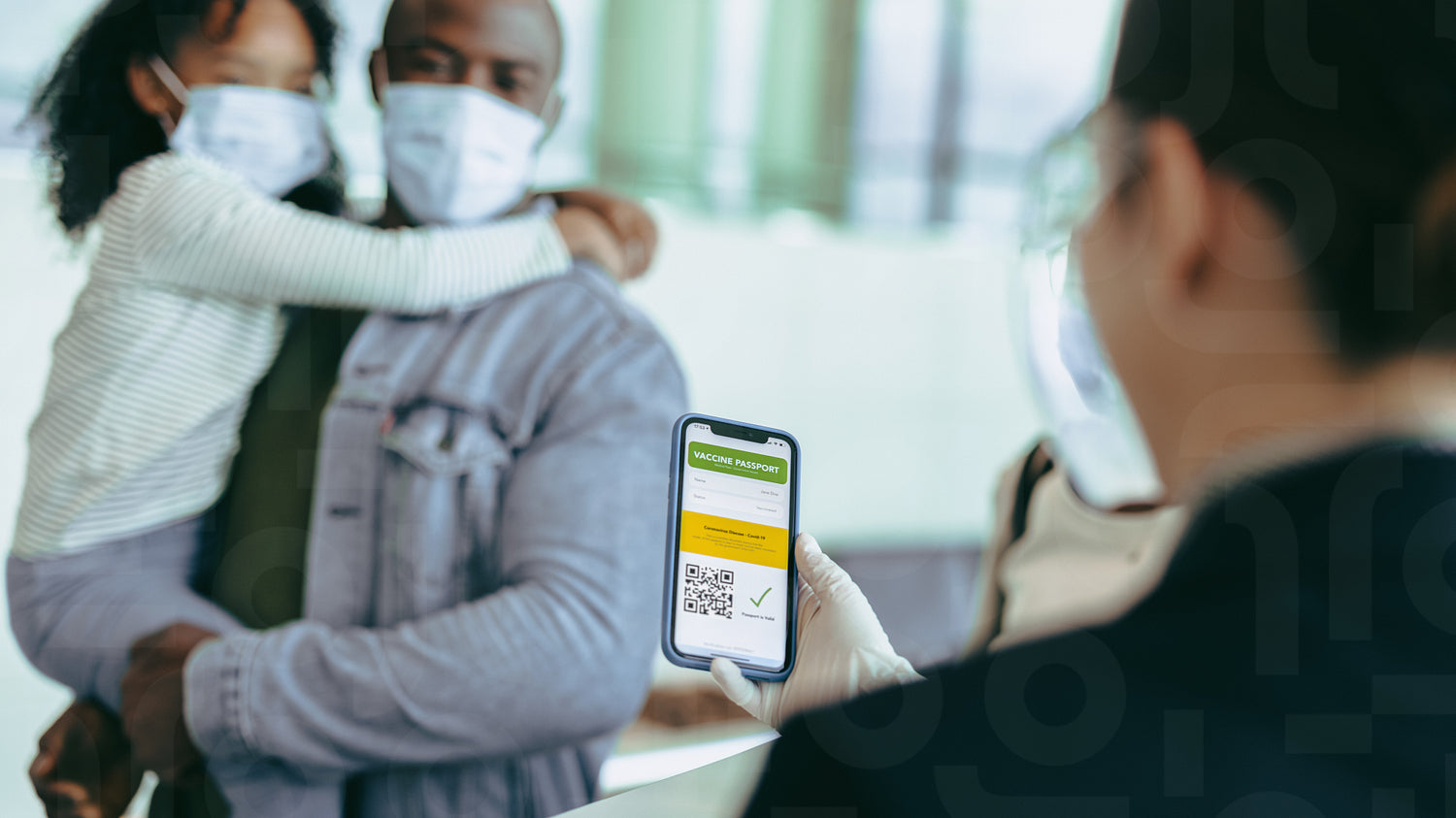 Airport staff holding vaccine passport on mobile phone of passenger at check-in counter. Ground staff examining vaccine certificate of traveller on their phone at airport.